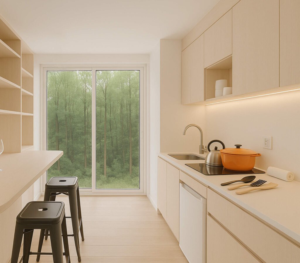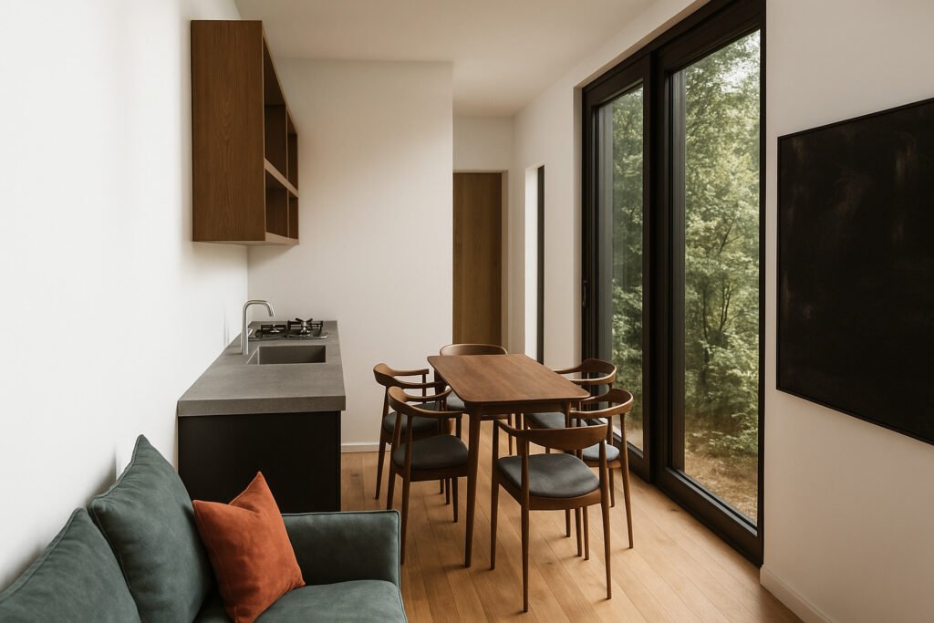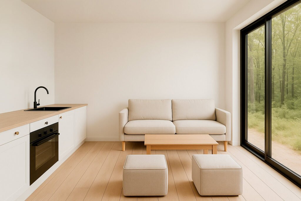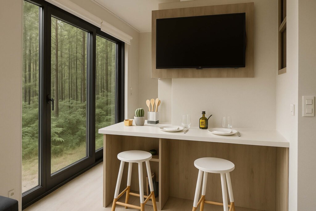 Un dormitorio, living y cocina integrados para optimizar el espacio. La solución perfecta para airbnb o refugios en espacios limitados.