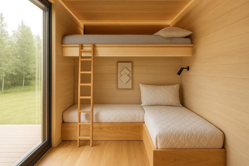 Una cama matrimonial, camarote, y cocina estratégicamente integrada al espacio para un grupo de personas sin perder comodidad y confort. La solución perfecta para un servicio múltiple de airbnb.